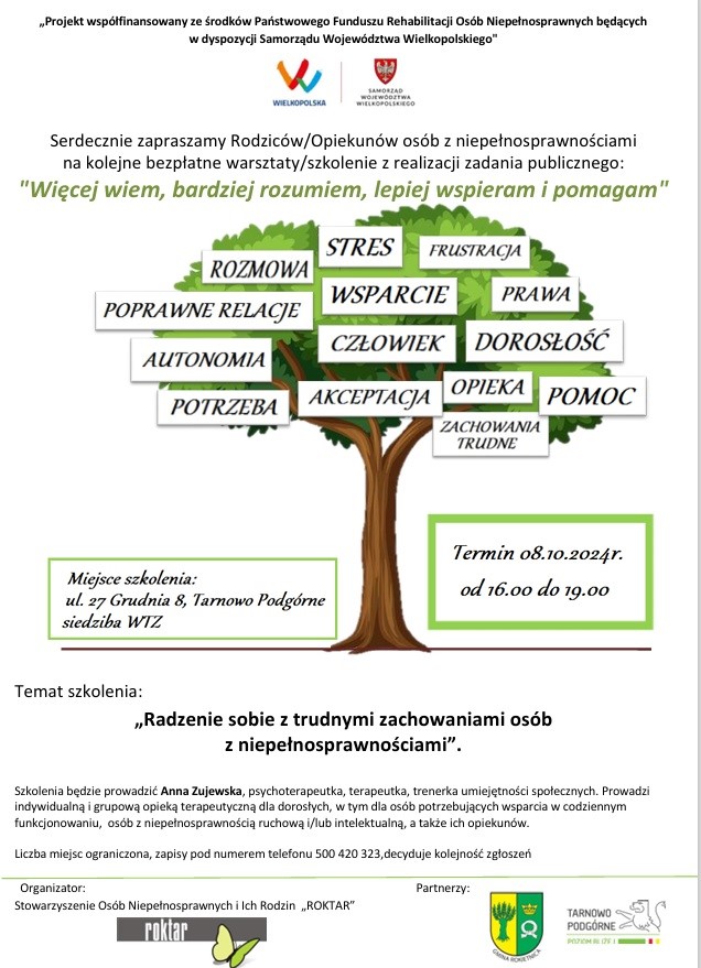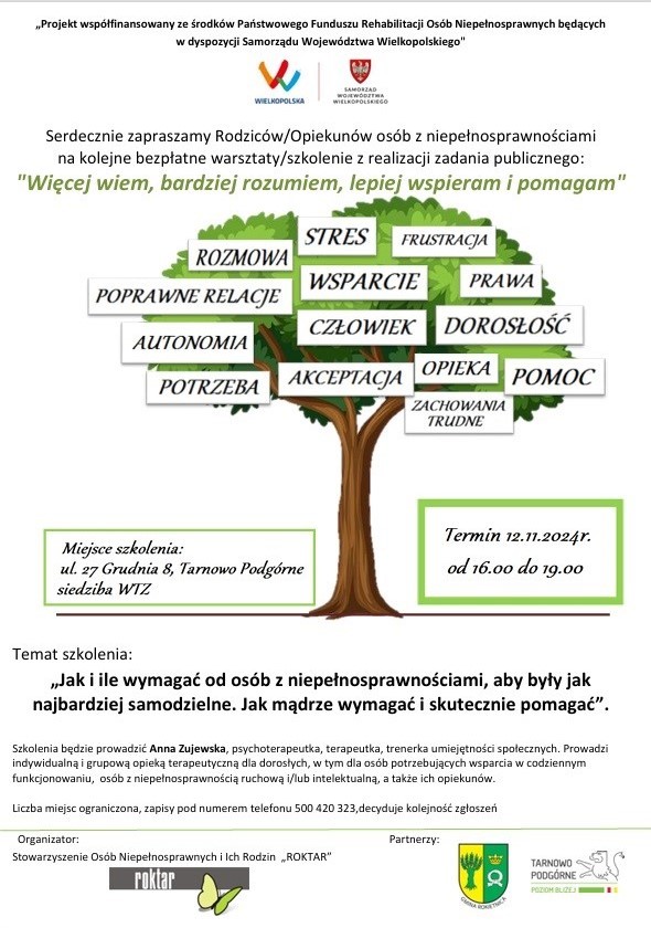 „Więcej wiem, bardziej rozumiem, lepiej wspieram i pomagam” – cykl warsztatów i szkoleń dla rodziców/opiekunów/kadry współpracujących z osobami z niepełnosprawnościami, to tytuł zadania publicznego realizowanego, od września do grudnia 2024r., przez nasze Stowarzyszenie.