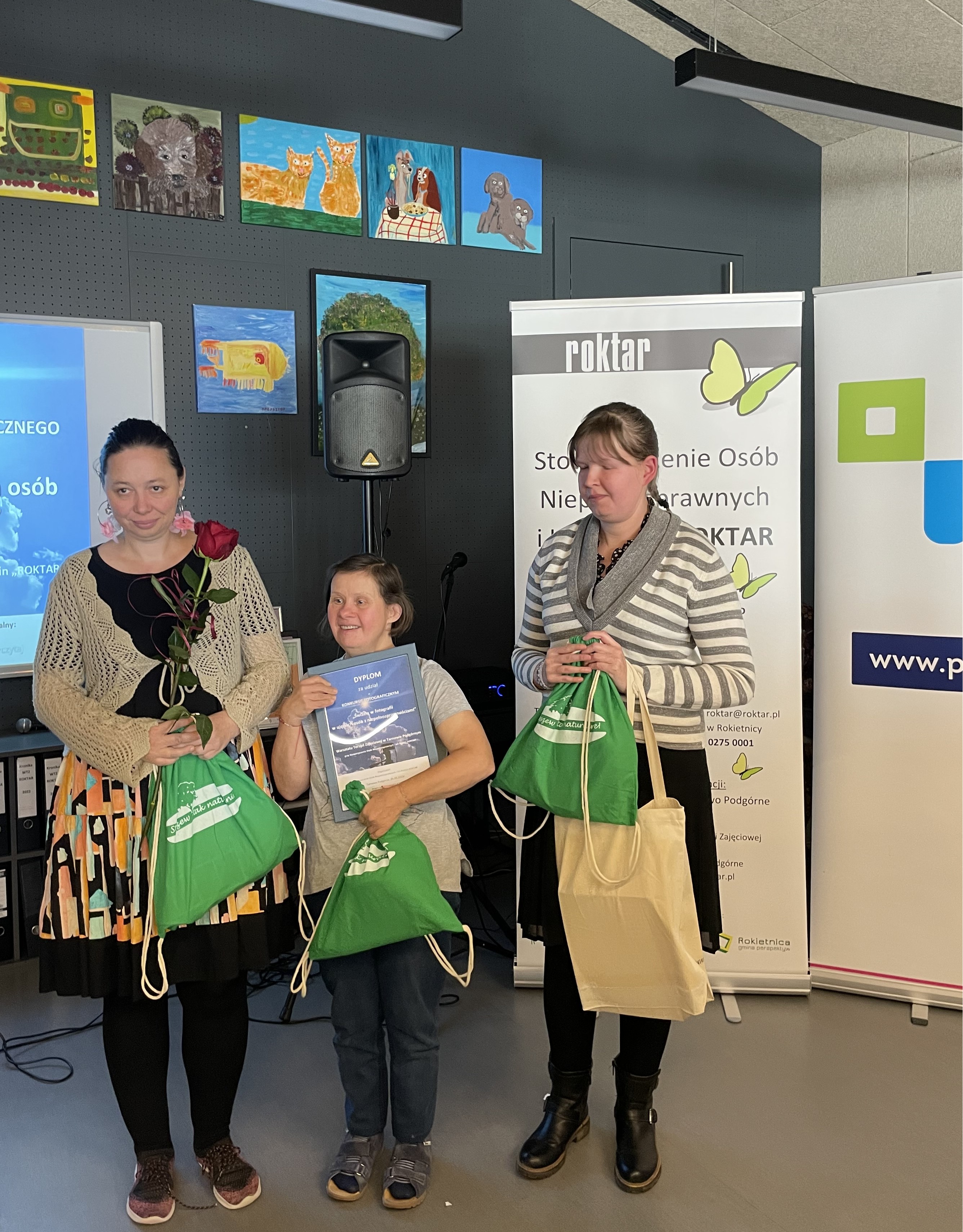 Prowadzący uroczystość, p. Tomasz Strykowski, pracownik Stowarzyszenia Osób Niepełnosprawnych i Ich Rodzin „ROKTAR”, powitał autorów zdjęć wraz z opiekunami oraz zaproszonych gości: p. Danutę Potrawiak – Sekretarz Gminy Rokietnica, p. Adama Biszczanika – Zastępcę Dyrektor Powiatowego Centrum Pomocy Rodzinie w Poznaniu, p. Izabelę Dziamską – Przewodniczącą Rady Gminy Rokietnica, p. Wandę Koralewską – Prezes Zarządu Stowarzyszenia „ROKTAR”, p. Agnieszkę Rzeźnik – Redaktor Naczelną „Sąsiadka – Czytaj”, p. Martę Zwolińską – Fogiel – Pracownika Biura Komunikacji Społecznej i Promocji w Tarnowie Podgórnym, p. Teresę Wieczorek Redaktor Naczelną „Rokickich Wiadomości”, p. Adama Michtę – Radnego Gminy Rokietnica i fotografa. Kapituła konkursowa, w skład, której wchodzili fotografowie, przedstawiciele powiatu poznańskiego znający problem osób z niepełnosprawnościami, oceniała w sumie 22 zdjęcia. Przyznano wyróżnienia dla Olgi Twardowskiej ze Środowiskowego Domu Samopomocy „Gościnni” z Kórnika za zdjęcie „Drogowskaz Świetlny”, dla Piotra Milewskiego uczestnika z WTZ Konarzewo za zdjęcie „Dotyk światła” oraz dla Pawła Kerbera z ŚDS „Gościnni” z Kórnika za fotografię „Witaj słoneczko”. III miejsce zajęła Joanna Michałek z WTZ w Tarnowie Podgórnym za zdjęcie „Światło w muszli”, II miejsce Magdalena Mazurek uczestniczka z WTZ w Luboniu za fotografię „Światło w chmurach”, natomiast zdjęcie Kingi Stefańskiej z WTZ w Tarnowie Podgórnym „Światło w zamkowym oknie”, zdobyło pierwsze miejsce. Oprócz nagród rzeczowych dla prac wyróżnionych i zwycięzców, zostały przygotowane dyplomy i upominki dla wszystkich placówek biorących udział w konkursie. Podczas uroczystości, w części artystycznej, wystąpiły reprezentantki Dziecięcego Zespołu Pieśni i Tańca „MODRAKI”. Uświetniły nasz wernisaż nie tylko pięknym śpiewem, ale także tańcem i grą na skrzypcach.